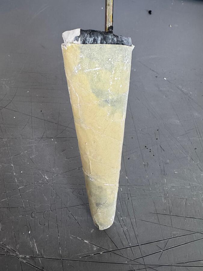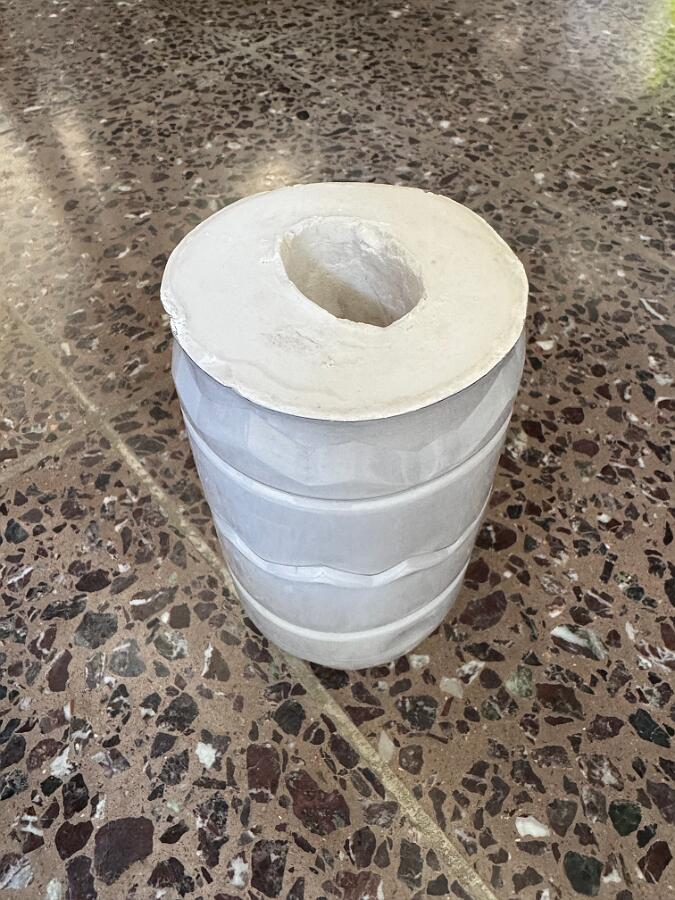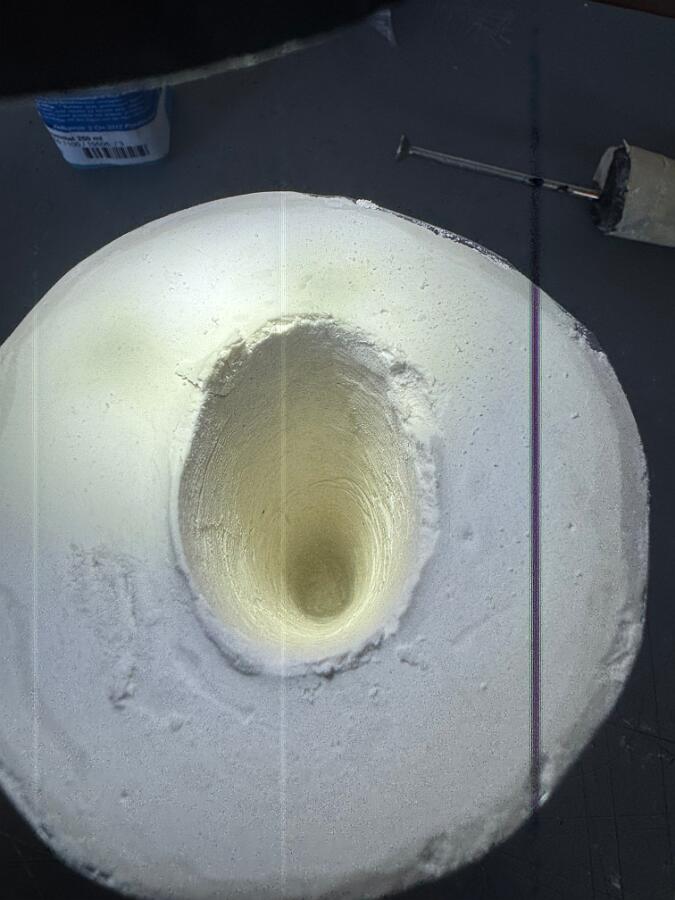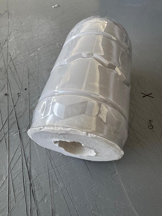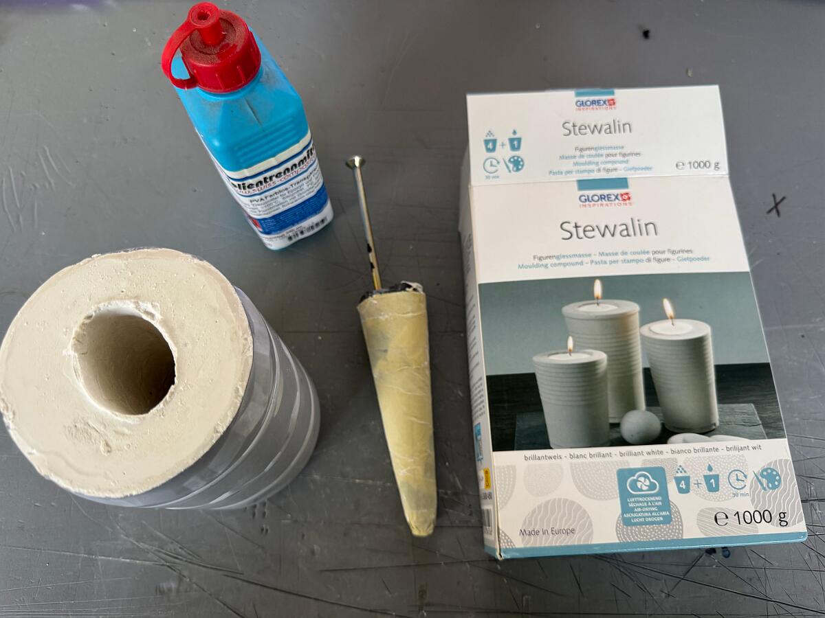 Ich habe zunächst eine Positivform erstellt und beginne nun mit der Herstellung der Negativform. Dafür verwende ich zum ersten Mal Stewalin von Glorex (Produkt-Nr. 62608450). Die Positivform habe ich mit Papierklebeband umwickelt und anschließend mit einem Trennmittel eingestrichen. Mir ist bewusst, dass es dafür geeignetere Produkte gibt, aber ich hatte noch etwas Folientrennmittel (PVA farblos transparent) zur Hand. Als Giessform habe ich eine 1,5-Liter-PET-Flasche zurechtgeschnitten und darin gemäß Anleitung X Teile Wasser mit X Teilen Pulver vermischt. Die Masse härtet relativ schnell aus – daher Vorsicht! Am besten beobachtet man den Prozess ständig. Bei etwa 80 % Aushärtung habe ich begonnen, die Positivform leicht zu bewegen. Das war notwendig, da meine Form nicht ganz glatt war. Kleine Rillen oder Vertiefungen hätten das Herauslösen sonst erschwert. Trotzdem hat es gut funktioniert, und die Negativform ist durchaus gelungen.